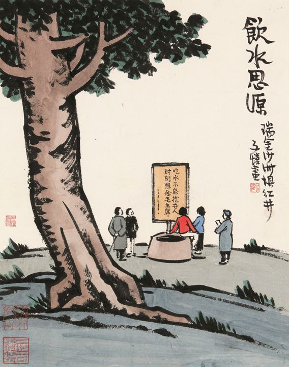 上海中国画院首任院长丰子恺先生的代表作漫画《饮水思源》起首,成为了展览的开篇。他根据江西瑞金沙洲坝“红井”绘制的设色水墨国画作品,画面以毛主席参与挖掘的革命旧址为背景,描绘了三两人物在井边围绕“吃水不忘挖井人”标牌讨论的场景,通过题跋“饮水思源”直白点明主题。